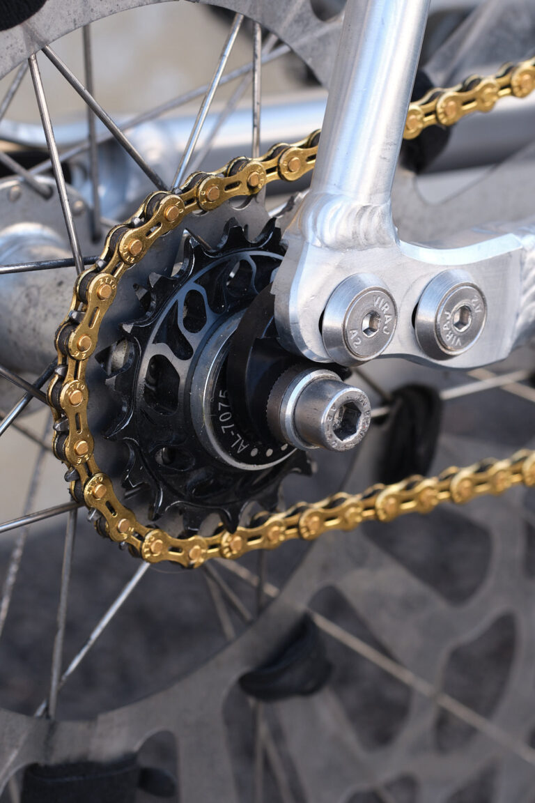 Contrairement aux idées reçues le bike polo se pratique avec une transmission en roue libre et non pas avec un pignon fixe. Le développement est court pour privilégier l'accélération.
